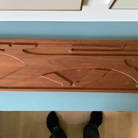 Relief, Dekoration i udskåret massiv teak fra 1960. Dreng der spiller trompet. Unikt lille værk. Mål 17 x 23.