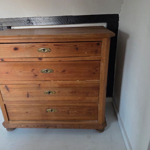 Virkelig fin kommode, men trænger til en kærlig hånd. Skufferne kører ikke godt og et håndtag røget af øverst og de andre skal der også kigges på, især det den nederste. Lidt pletter foroven. Vejer godt til.