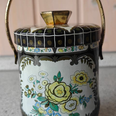Ældre dåse fra Dansk engelsk lakrits fabrik Glostrup. Den er mørkegrøn og ca 20 cm høj. Der har siddet tape omkring åbningen på et tidspunkt - men jeg tør ikke skrubbe/fjerne det for at undgå at det fjerner farven.