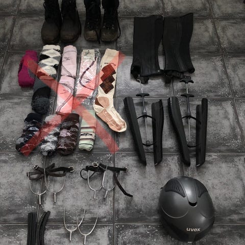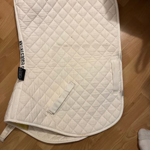 Underlag, Shires Equestrian,Dressur, Str S+ ridepisk, lyseblå med jordfarvet + hvide kanter + på midten, quiltet, på bagsiden gul "pels", måler 50 cm foroven, 37 cm fra midten og ned. 15"-16" , velcrobånd på hver side ridepisken er 50 cm lang og sort. Begge dele er nye og ubrugte. Sælges samlet for 149 kr. Sender gerne, dog ikke med fiks Færdig. porto oveni
