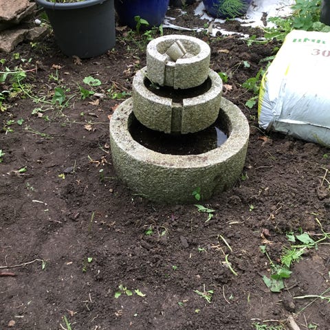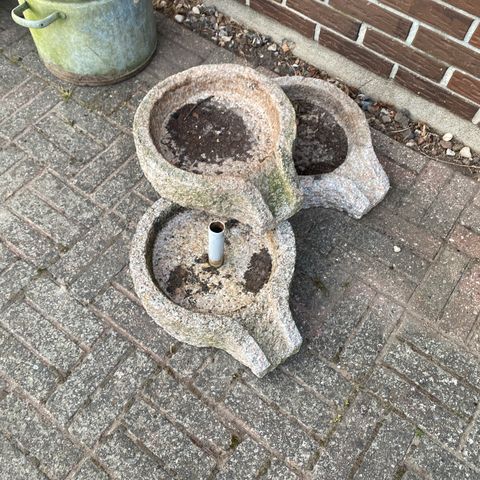 Har en samlet vandfald afløb uden vandpumpe. Afløb og fandfald er granit og meget robust. Kan sættes forskelligt. Afløb bestå af 3 dele og vandbeholder med en fandfald på ca. 50 cm. i højden. Sælges samlet eller enkelt.