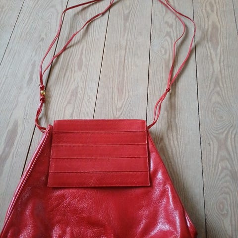 Skøn original Sabrina Pilewicz vintage taske med patina, den har fået frisk infarvning og læderfedt sunset rød (farven følger med til opfriskning den har kostet 150 kr.).