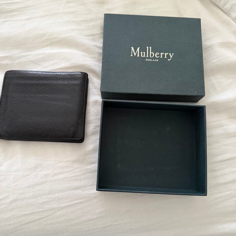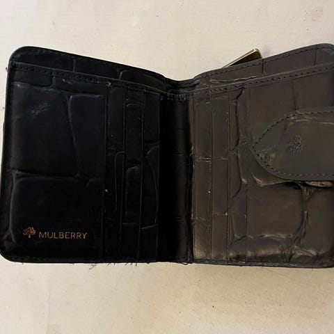 Mulberry læder pung i sort farve. Pungen har flere rum til kort, sedler og mønter, herunder en lynlåslomme. Materialet er ægte læder, og pungen er velegnet til daglig brug til opbevaring af personlige ejendele.