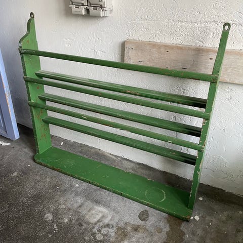 Smukt patineret blå tallerkenrække. Hylden er 90x56 cm og 12 cm dyb.