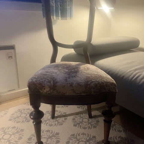 Stolen har en elegant, buet ryg og et polstret sæde med stribet mønster. Træramme.,Afhentes i:,Røde Kors Ølby/Køge (259),Bemærk at mail, chat og beskeder ikke besvares, og varen skal købes på knappen "Gå til varen"