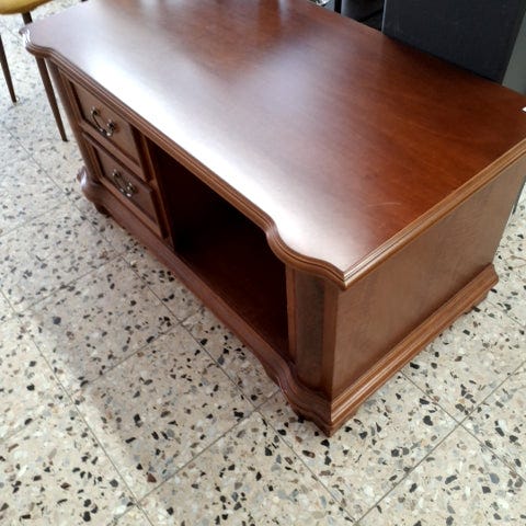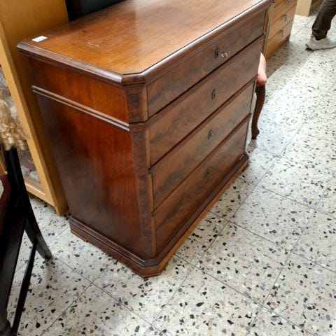 Kommoden har fire skuffer med metalhåndtag. ,Afhentes i:,Røde Kors Ølby/Køge (259),Bemærk at mail, chat og beskeder ikke besvares, og varen skal købes på knappen "Gå til varen"
