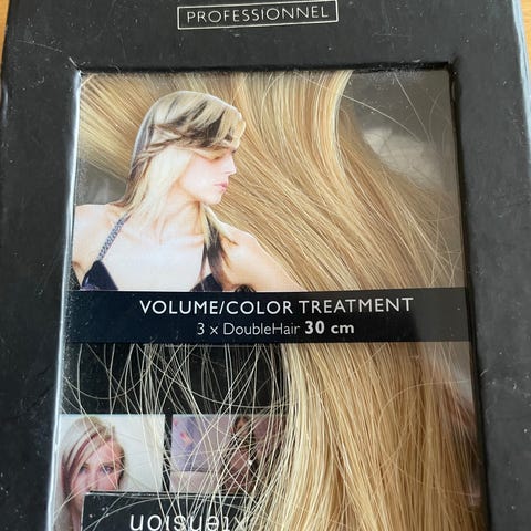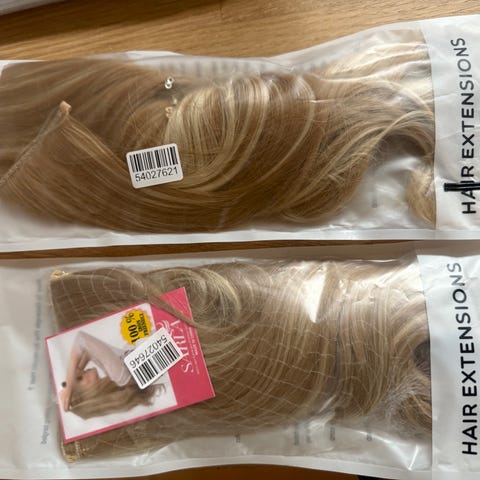 Sæt bestående af lys blondt hårstykke, der kan anvendes til hårforlængelse eller styling. Hårstykket har en naturlig glans og bølget tekstur, der passer til forskellige frisurer. Materialet fremstår som ægte eller syntetisk hår, egnet til personlig brug eller som tilbehør til parykker. 19 cm