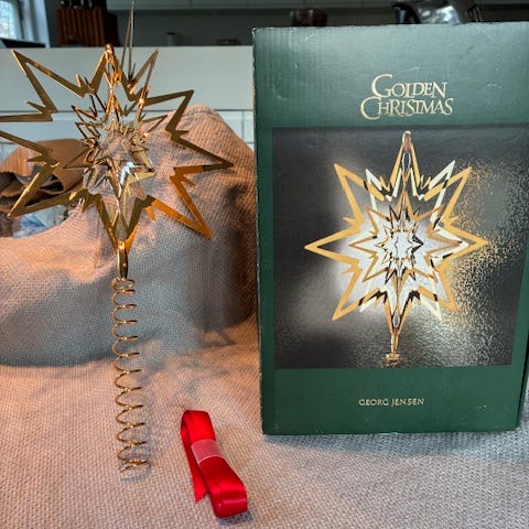 Super flot topstjerne fra Johanne by Georg Jensen med hvidt langt silkebånd, så den kan hænge hele december, hvorefter den juleaften kan sættes på juletræet med den medfølgende spiral.