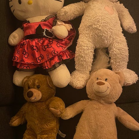 fyld din egen mini Build A Bear hjemme :) Build-A-Bear Workshop sæt, der inkluderer en blå fyldemaskine og fire små bamser. Fyldemaskinen har et gennemsigtigt rum til fyld med en håndsving på siden, og den er pyntet med en gul bamsefigur øverst. De medfølgende bamser har farverige og mønstrede designs, herunder regnbuemotiver og leopardtryk.