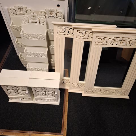 Dette er et vægmonteret spejl indrammet i træ. Rammen har en klassisk, naturlig træfærdig overflade med dekorative brune kantdetaljer. Spejlet inkluderer en indbygget knagerække med fem knager nederst til ophængning af små genstande såsom nøgler eller tørklæder. Det kan hænges op via snorene på bagsiden. Den samlede størrelse er 41x30 cm.