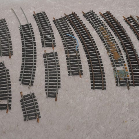 Sæt bestående af forskellige modeljernbane skinner og sporskifter med elektriske kontakter. Inkluderer lige skinner, kurveskinner, krydsningsskinner og sporskifter i forskellige størrelser. Materiale primært metal og plastik. Egnet til modeljernbaneopbygning og tilslutning med elektriske signaler. Farve: primært sort og grå med metaldele.