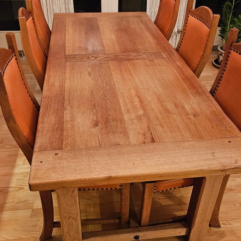 Massivt egetræ, med to plader så bordet kan forlænges med en meter