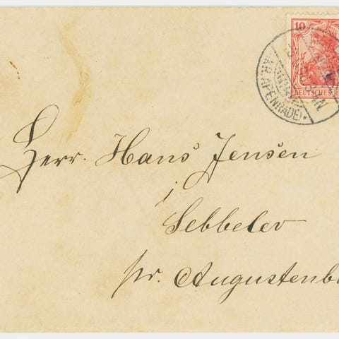 Brev med 4 sk. brun 1858, afsendt fra Schenefeld ved Hamborg og med rammestempel L.P. No.3 (= Landpost Schenefeld). Men brevet havnede fejlagtigt i Augustenborg på Als, hvor forsendelsen blev annulleret med nr.stempel 97 (sjældent nummerstempel). Brevet sendt retur til Slesvig. Via Itzehoe, stemplet 15.1.1859, ankom brevet endelig til Carlshütte ved Rendsborg. Meget speciel forsendelse.