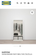 KLEPPSTAD garderobe skab i hvid sælges. Kun brugt i 6 mdr. I fin stand fraset enkelt lille afskalning af maling samt lille søm fra skabets bagplade, der er slået lidt skævt (se billeder)