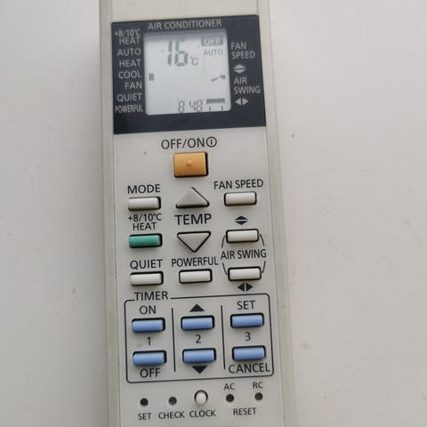 Universal Air Conditioner fjernbetjening i hvid plast. Udstyret med knapper til temperaturstyring, ventilatorhastighed, luftretning og timerfunktion. Strømforsynes med to AAA-batterier (ikke inkluderet). Designet til brug med forskellige aircondition-enheder.