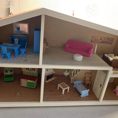 Lisa Dukkehus Møbler i træ, miniature størrelse. Sættet indeholder sofa, lænestol, sofabord og skab i træ med brun læder polstring. Designet til brug i dukkehuse og som legetøj til børn.