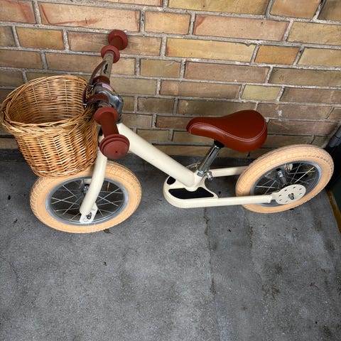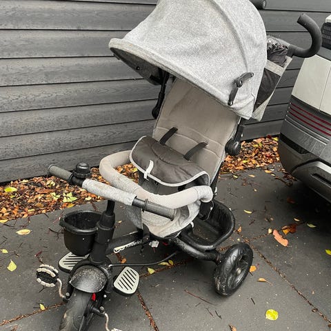 smarTrike Tricycle med solskærm og justerbar styring. Farver: blå og brun. Materiale: plast og metal. Designet til børn med sikkerhedssele, rygstøtte og fodstøtte. Udstyret med opbevaringskurv bagpå og lille kurv foran. Kan styres af voksen via håndtag bagpå, som kan jursteres i højden. Babysædet kan tages af, ( som vist på billede 5) så barnet kan bruge cyklen et par år mere.