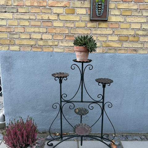 Denne retro blomsterstander har fem planterholdere med en kombination af metalramme og marmorborde. Den er designet til at holde flere planter i forskellige højder og har en rustik finish med tegn på aldersrelateret patina. Højden på de øverste planteholdere er cirka 65 cm. Materialerne omfatter metal og marmor, og designet passer til indendørs brug.
