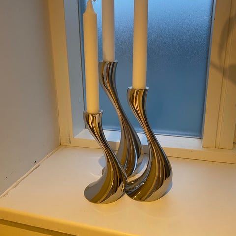 Georg Jensen Classic lysestager i rustfrit stål. Sættet består af tre forskellige størrelser lysestager med en skinnende finish. Designet til at holde standard stearinlys og anvendes som dekoration eller til belysning i hjemmet.