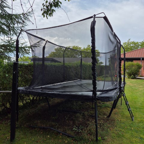 Stor trampolin i 2 niveauer. Brugt en sæson, men stået ude i 2. Helt intakt. Ingen huller, hverken i net, dug, fjedreafdækningen eller coveret.