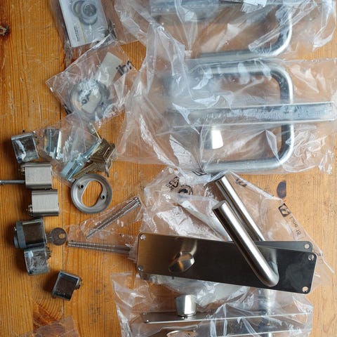 Låsehåndtag i sølvfarve med integreret kodesystem og inkluderet monteringsskruer. Håndtaget er designet til at sikre adgangskontrol og kan anvendes til døre, hvor ekstra sikkerhed er ønsket. Materialet er metal, og designet er funktionelt med fokus på sikkerhed.