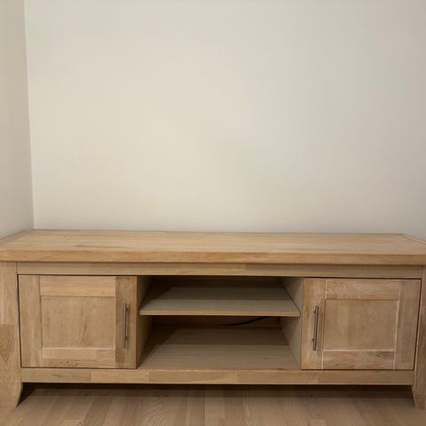 Restaureret tv-bord / tv bord / reol i bøg / bøgetræ i flot dansk design. Står med brugsspor og patina. 1 til vellignende haves.