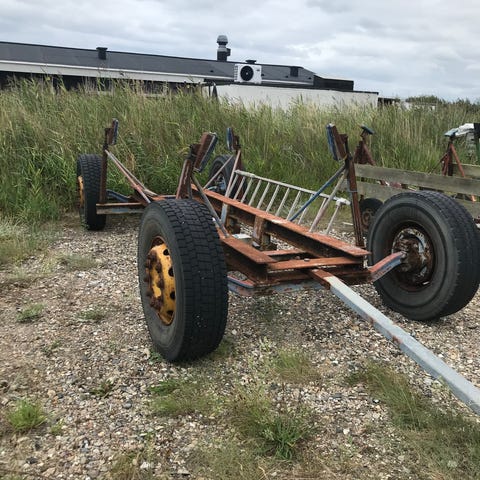 Der har lagt en 27 fods motorbåd på vognen. Den kan tage lidt større eller mindre. Den triller godt.