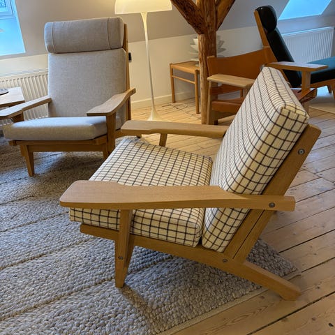 Hans J. Wegner, Ge370, Lænestol, Wengers ikoniske model Ge370 i massiv egetræ som fremstår smuk og virkelig velholdt, monteret med bamsearme samt originale hynder og nye gjorder.
