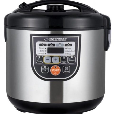 DeLonghi MultiFry Multicooker med digitalt display og drejeknap til valg af madlavningsfunktioner. Enheden har en gennemsigtig låg og en hvid og sort farve. Designet til tilberedning af forskellige retter ved hjælp af flere madlavningsmetoder.