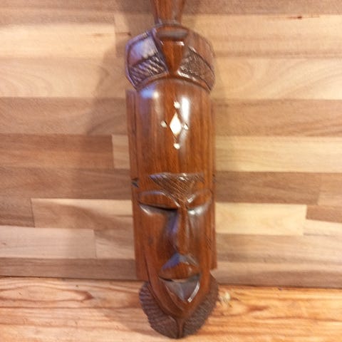Håndskåret træmaske med detaljeret udskæring og naturlig træfinish. Masken har en udtryksfuld ansigtsudformning med dybe furer og udskårne øjne, næse og mund. Velegnet til vægophæng som dekorativt element i hjemmet eller som samlerobjekt.