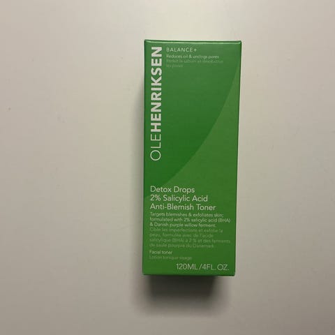 Ole Henriksen Detox Drops 2% Salicylic Acid Anti-Blemish Toner is a skincare product designed to help reduce blemishes. It contains 2% salicylic acid and comes in a 120ml bottle. The toner is formulated to cleanse and exfoliate the skin, suitable for use as part of a skincare routine.