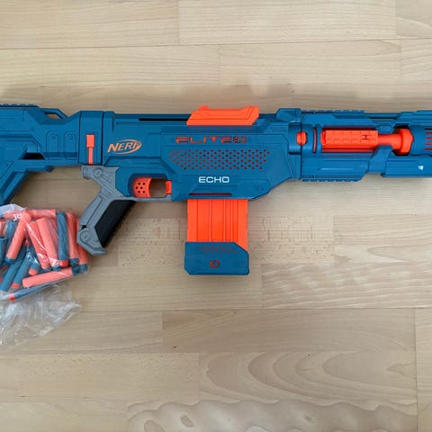 Sælger denne nerf elite 2.0 turbine som skyder nerf skud med 4 skud i sekundet. Det gør denne nerf gun til en rigtig sjov ting at skyde med. Den kommer også med et sejt gennemsigtig magasin, og 12 nerf skud. Den koster 500 fra ny, og jeg sælger den for 180. Batterier er inkluderet.