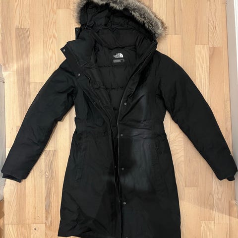 En fin pige/dame The North Face, model "Artic parka" dunjakke i størrelse small. Brun med diskrete North Face logoer. Rigtig varm og med hætte. Desværre er den oprindelige pelskrave/kant på hætten blevet væk, da den ikke blev brugt med jakken. Men superfed uden pelskrave heldigvis. En jakke til omkring 3000kr fra ny. Kan sendes.