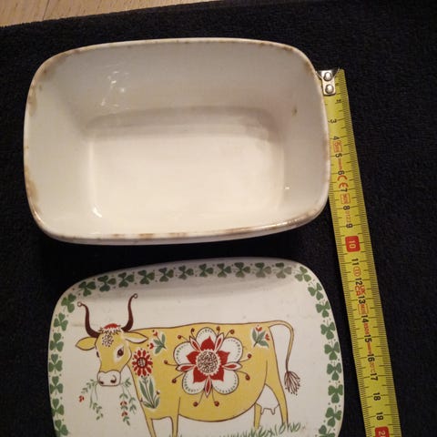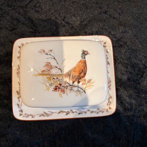 Jagtstellet designet af Mads Stage for Imerco. Smørboks / smørskjuler med Fasan motiv.