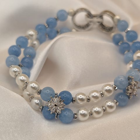 Armbånd med perler i glas og metal. Koral og sølvfarve