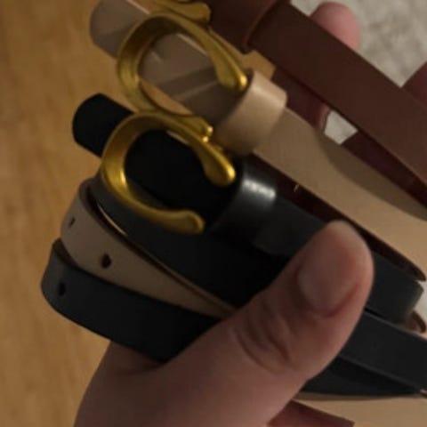 Sælger et sæt med 3 flotte modebælter i farverne sort, kamel (brun) og kaki (beige).