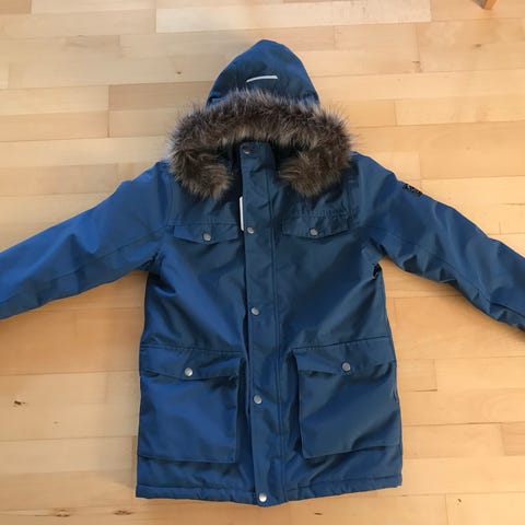 Name it vinterjakke i størrelse 164 til drenge. Jakken er blå og har en aftagelig hætte med pelskant (kan knappes af), lynlås og knaplukning foran og flere lommer til opbevaring. Den er designet til at holde barnet varmt og beskytte mod vind og vejr. Indvendigt foret for varme og komfort. Dejligt vindfang ved ærmerne.