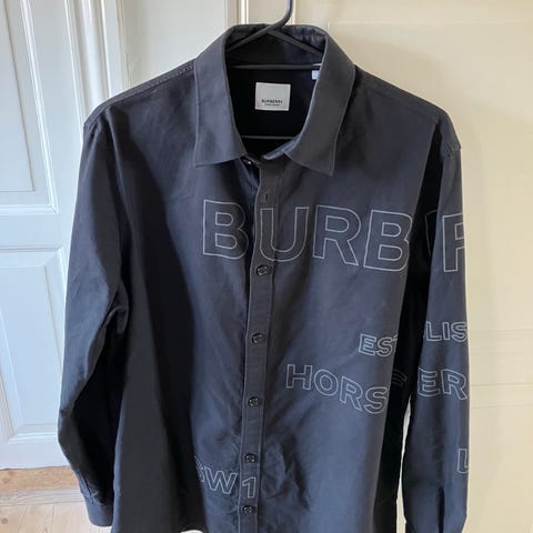 Burberry Slim Fit skjorte i størrelse L til herre. Skjorten er sort med karakteristiske Burberry-detaljer, herunder ternede manchetter og kraveindlæg.Kom med et bud.