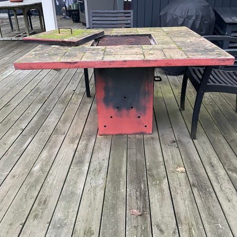 Udendørs grill lavet af beton med integreret skorsten. Designet til havebrug med plads til kul og madlavning på åben ild. Indeholder hylde til opbevaring af brænde eller tilbehør under grillområdet. Velegnet til udendørs madlavning og samlingssted i haven.