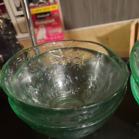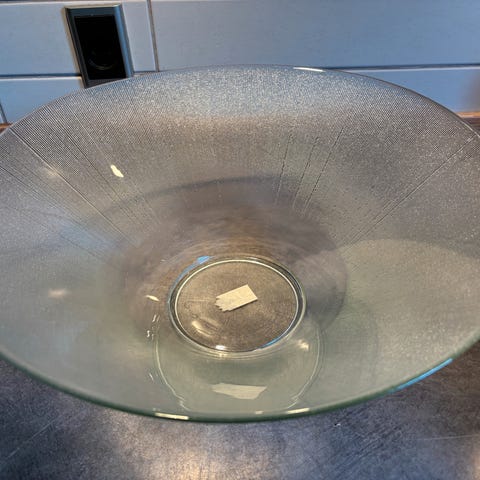 Produktet er en rund skål lavet af klart glas med en struktureret bund. Glasset har en glat overflade. Rustik.,Afhentes i:,Røde Kors Egå (751),Bemærk at mail, chat og beskeder ikke besvares, og varen skal købes på knappen "Gå til varen"