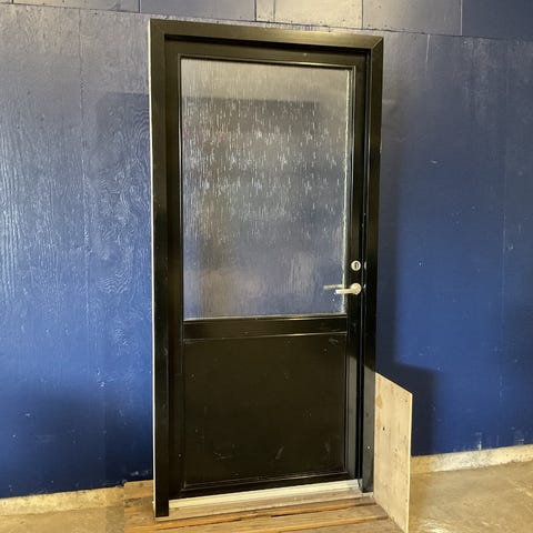 Brugt Idealcombi Yderdør, Alu/træ, 2 lag glas, hårdttræsbundstykke, venstrehængt, indadgående, overparti Varenummer: 1215