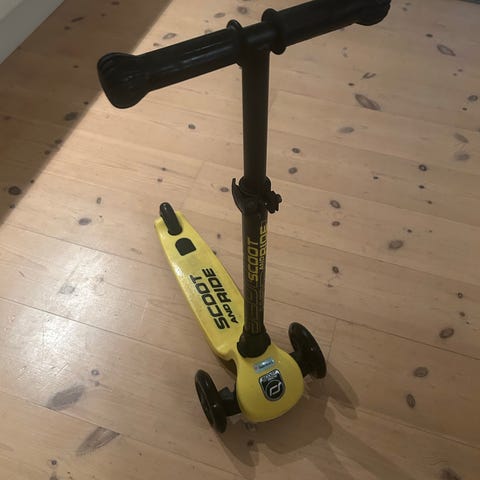Scoot and Ride Highwaykick 1 løbehjul i pink farve, designet til børn. Løbehjulet har tre hjul for stabilitet og en justerbar styrstang. Materialet er holdbart plast og metal. Egnet til børn til udendørs leg og transport.