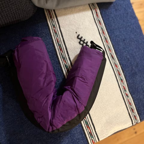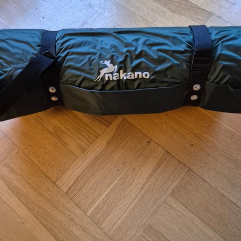 Billederne viser en sammenpakket oppustelig liggestol af mærket Nakano. er opbevaret i en grå opbevaringspose med en snorelukning og en strop til nem transport. liggestolen virker kompakt, hvilket gør den let at bære med sig på camping- eller vandreture.