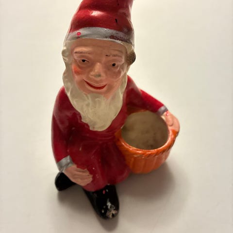 Dette er en dekorativ figur forestillende en nisse, der sidder i en stol med fødderne i et bassin. Figuren har en rød nissehue, en rød trøje, og grønne bukser. Den er placeret på en base, der ligner et træbræt med sokker og en spand ved siden af. Figurens detaljer er farverige og skabt med omhu for at fange en hyggelig hverdags scene.