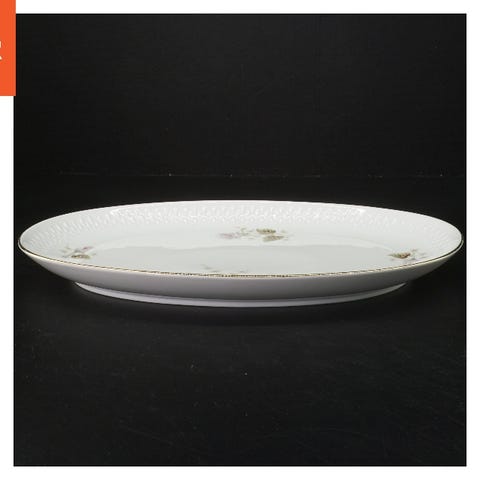 To ovale porcelænsfade med et dekorativt mønster på indersiden og en guldkant langs randen. De er begge mærket med 'Edelstein Bavaria'. Størrelsen af hvert fad er 24,5x13 cm. De er velegnede til servering af mad eller som pyntegenstande.