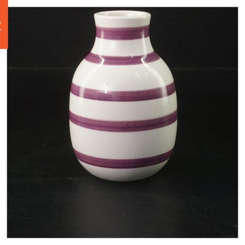 Dette er en lille vase fra Kähler, dekoreret med sorte vandrette striber på en hvid keramisk overflade. Vasens størrelse er 8x5 cm, ideel til små blomsterarrangementer eller som et stilfuldt dekorativt element i hjemmet. Kähler-logoet er tydeligt synligt på bunden af vasen sammen med en designer signatur.