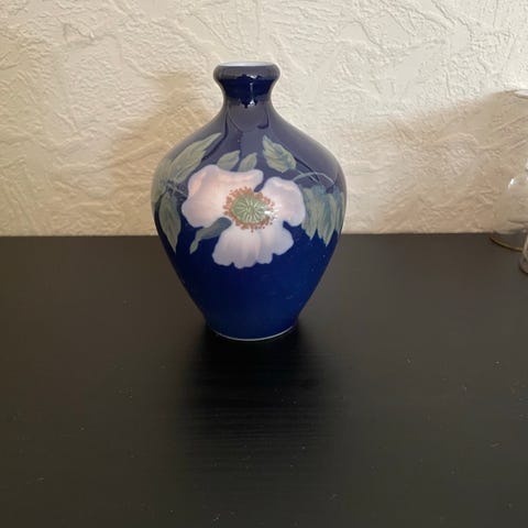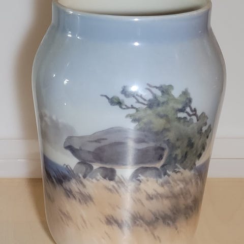 Dette er et sæt af to porcelænsvaser fra Bing & Grøndahl. Den ene vase har en højde på 11 cm og en diameter på 6 cm, mens den anden vase er 10,5 cm høj med en diameter på 7 cm. Begge vaser har et blåt og hvidt farveskema med naturskønne motiver, der inkluderer en strand og kaktus. Bunden af vaserne viser Bing & Grøndahls logo samt nummerering.