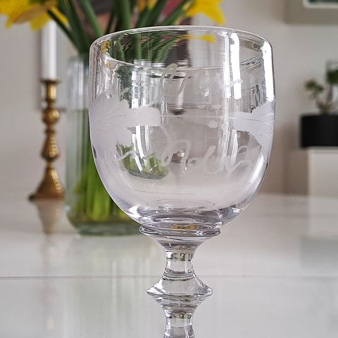 Vinglas med ægformet kumme på spoleformeæt stilk med knap. Dekoreret med matslebet stærkt bølget egeløvsfrise af fire 7-fligede blade med nervestreger, 2 agern og små krøllede blade skiftevis over og under egebladene.