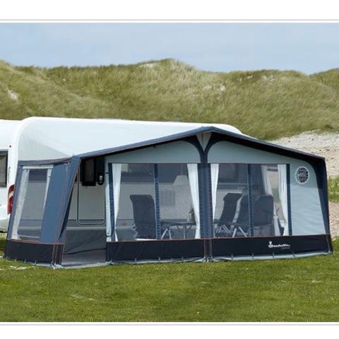 Isabella Capri Lux fortelt. Teltet leveres med tilbehør som Zinox stålstænger, pløkker, hjulafdækning i vognens længde, gulvtæppe, plast underlag og gardiner