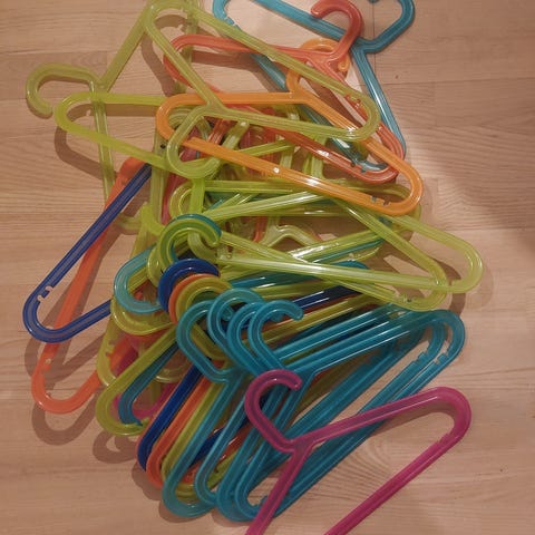 Forskellige farver bøjler i børnetøj størrelse som på billede, i alt 45 stk.
